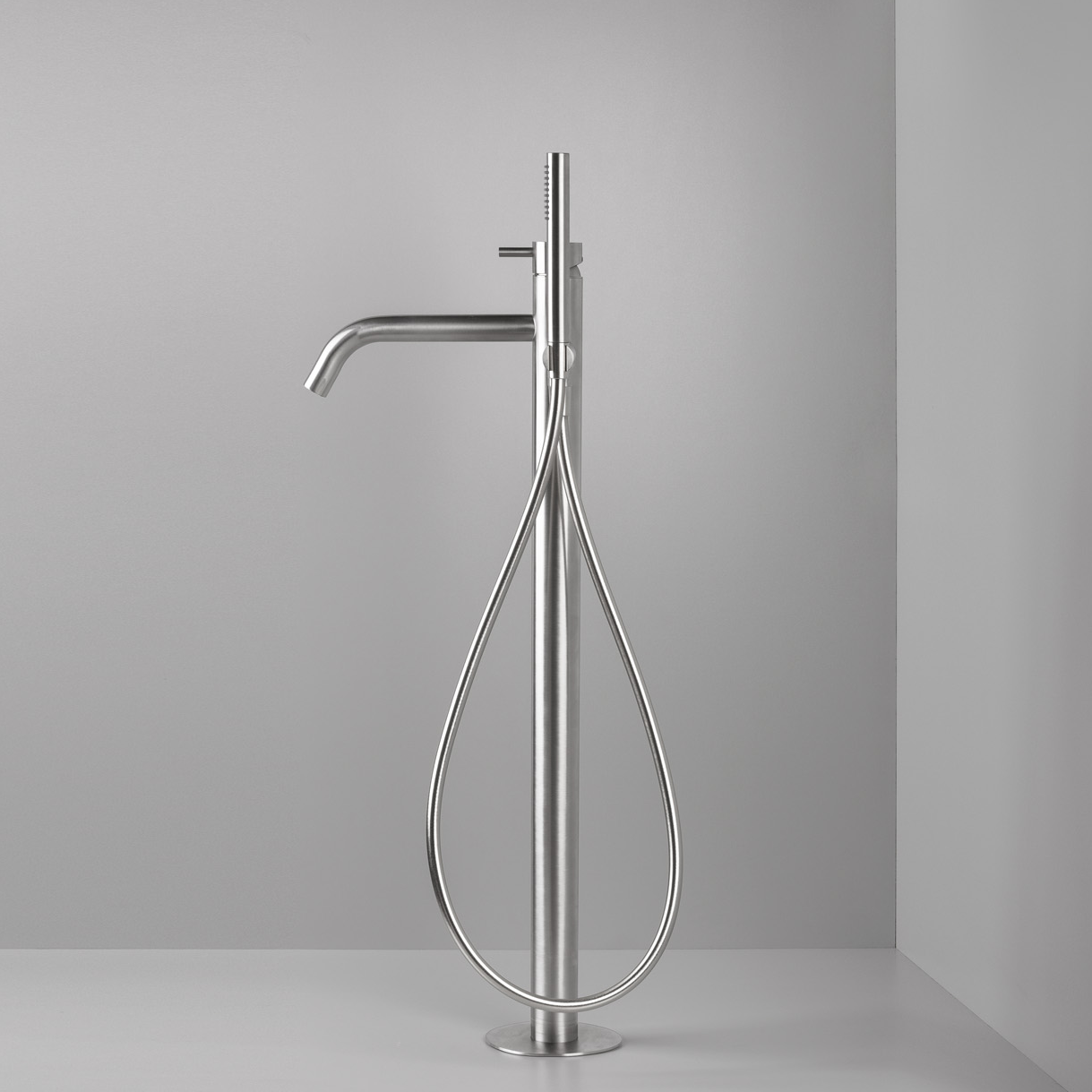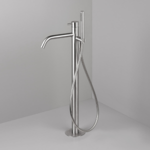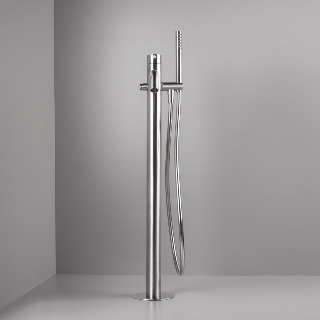 Arno golvstående badkarsblandare från LH. Rostfri blandare tillverkad i 316L stål och i en modern design. Arno badkarsblandare levereras komplett med handdusch och slang.
