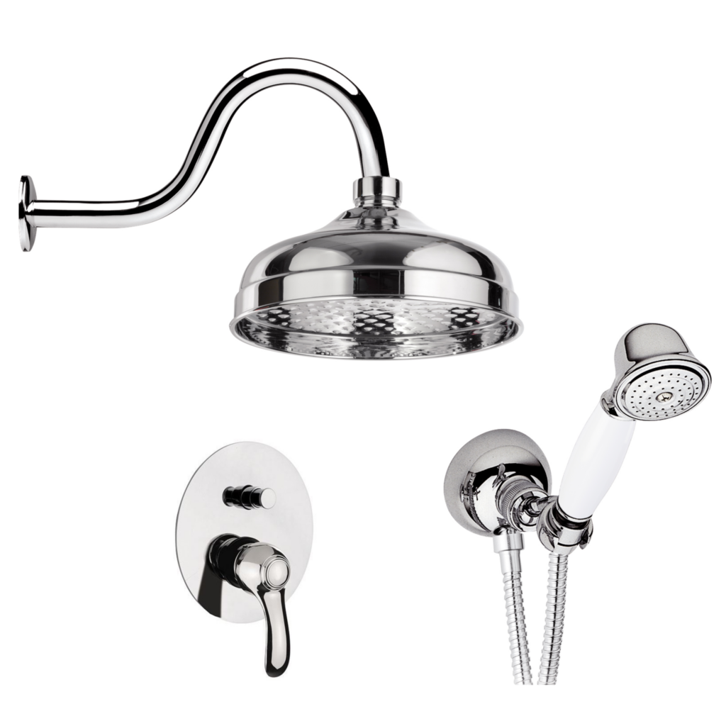 Classic badkarsblandare med handdusch från LH. Blandaren i mässing monteras med fördel i vägg med de medföljande täckkåporna för en sömlös finish. Denna Classic badkarsblandare har en pip för påfyllning av badkar.
