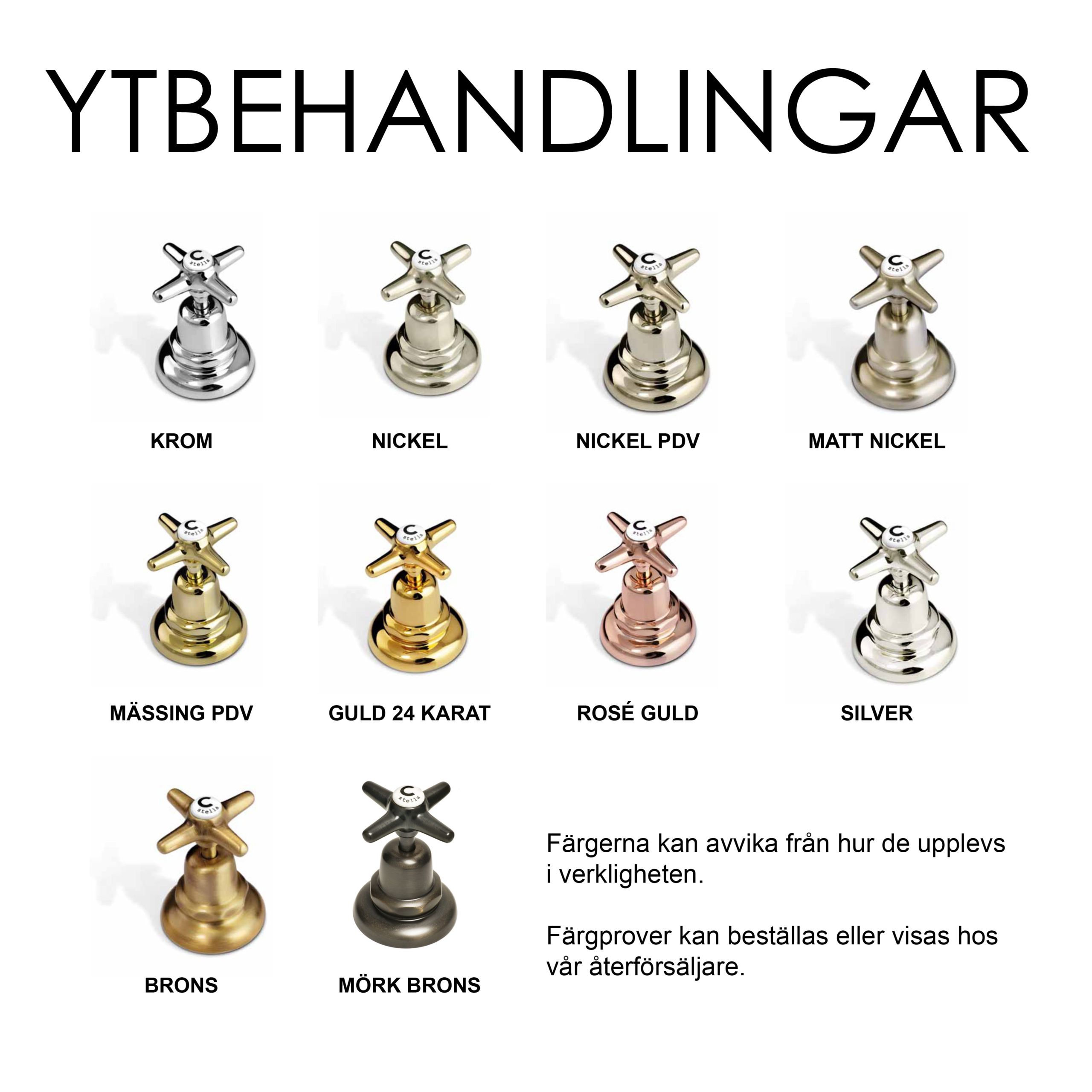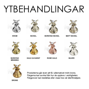 Borstad mässing, Borstad nickel, Brons, Guld, Krom, Mässing PVD, Matt nickel, Matt svart, Mörk brons, Nickel, Nickel PVD, Rosé guld