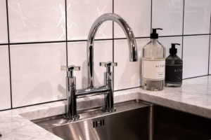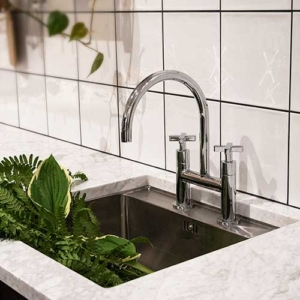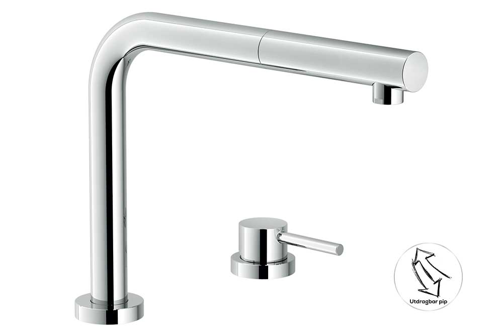 Modern 2-håls och 2-grepps köksblandare med en industriell design i krom.