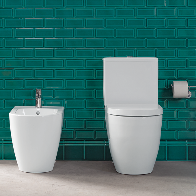 Komplett toalettpaket inklusive mjukstängande sits (softclose) och variabla anslutningsdelar för golv- eller väggavlopp.