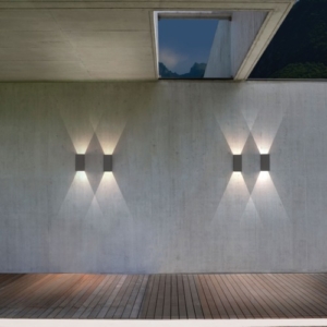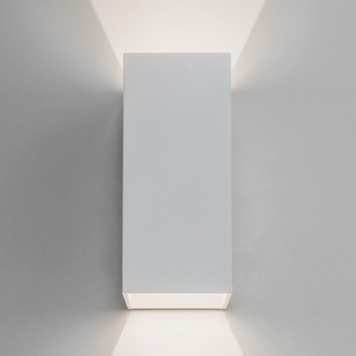 Oslo 160 LED från Astro. Kantig väggarmatur för montering utomhus. Stilren fasadbelysning som kastar ett skarpt ljussken på väggen.