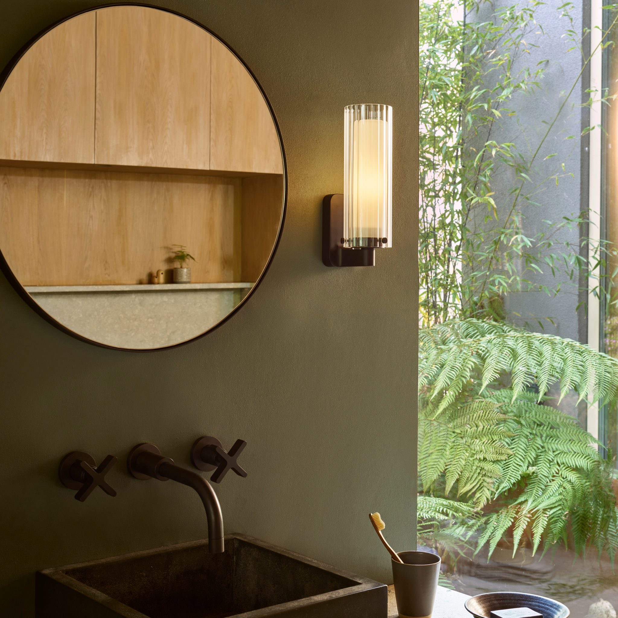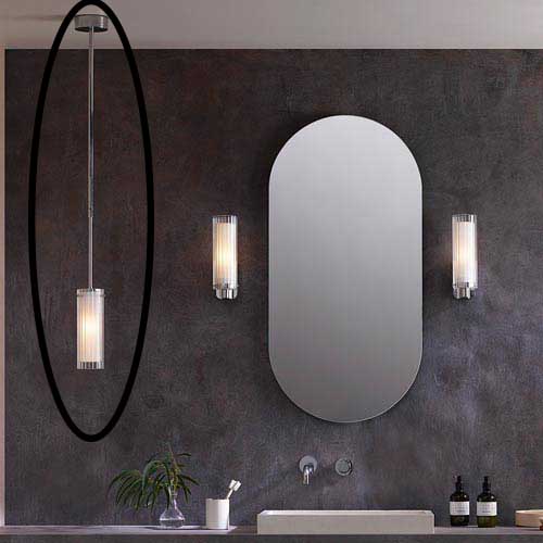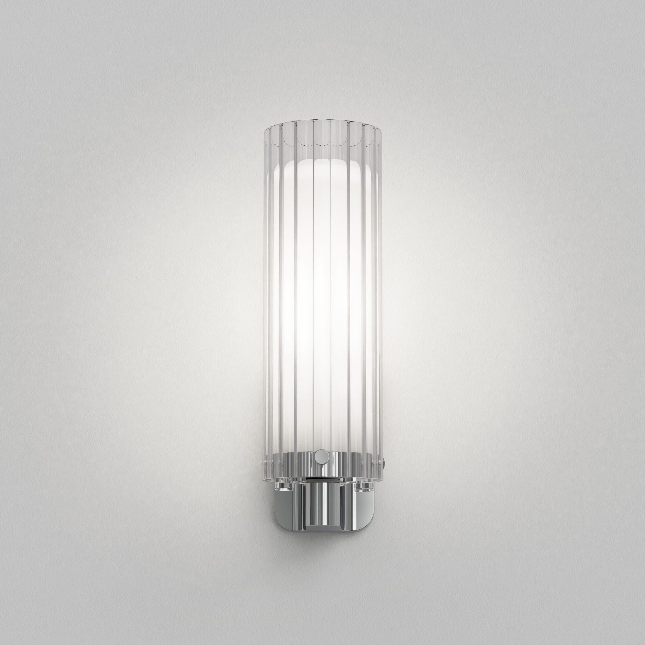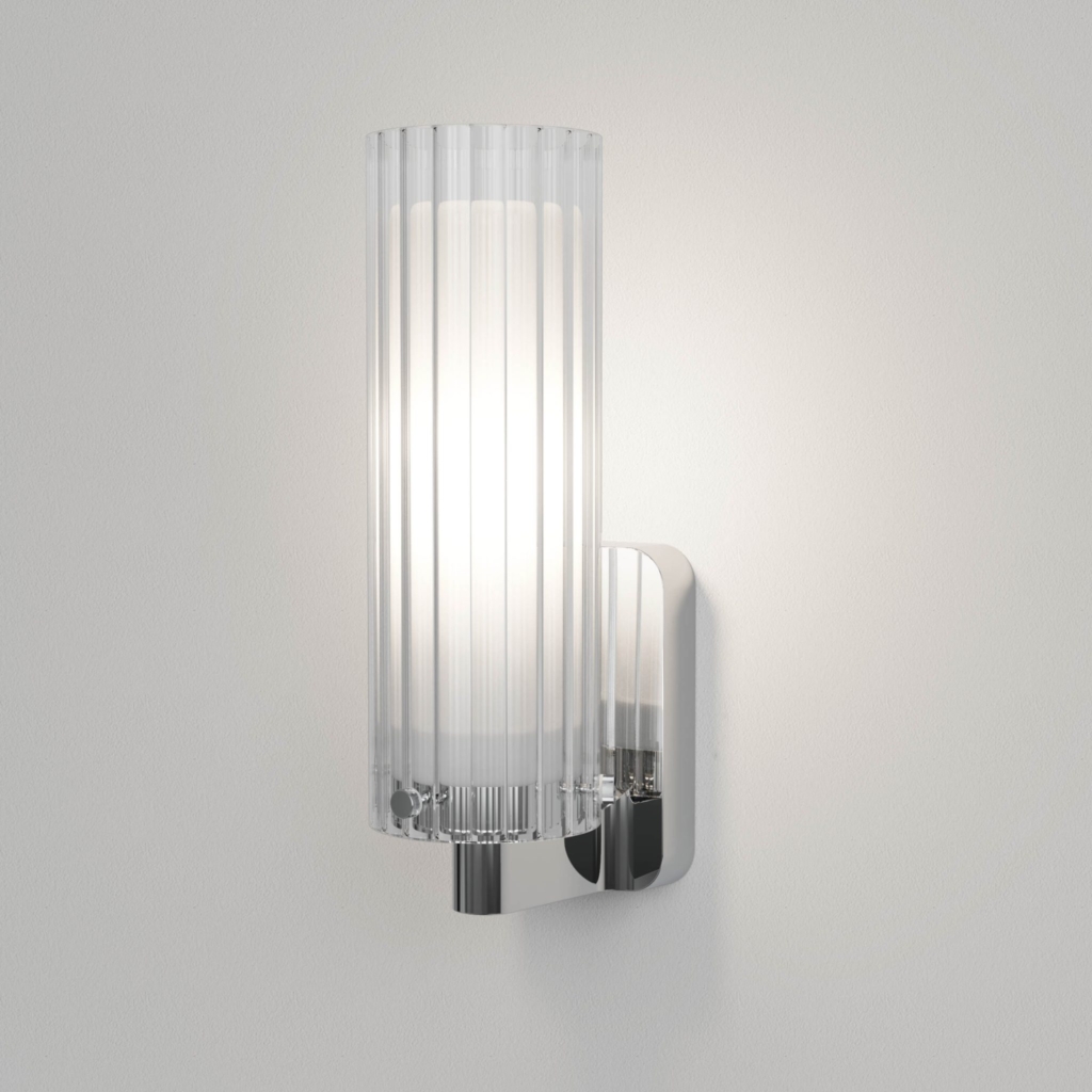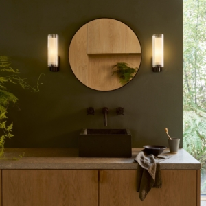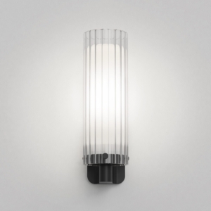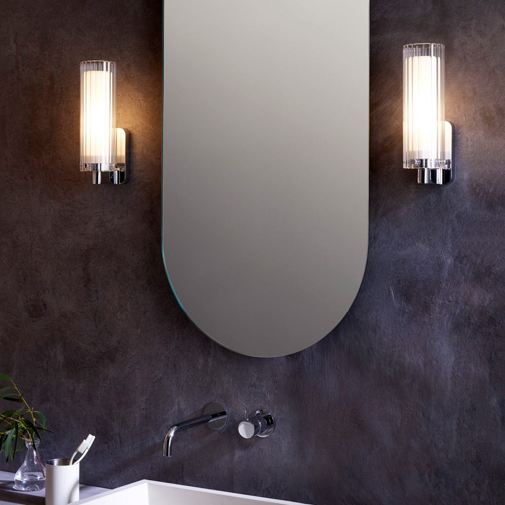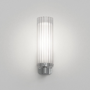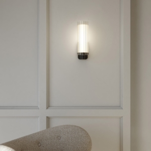 Ottavino Wall väggbelysning. Ett mjukt arbetsljus vid placering på vardera sida om en spegel. Lampan har dubbla lager av glasskärmar där den yttre har ett vågformat mönster. Ottavino Wall erbjuds i matt svart finish och krom.