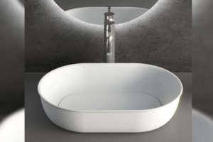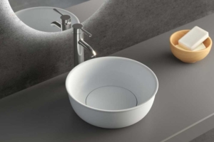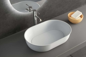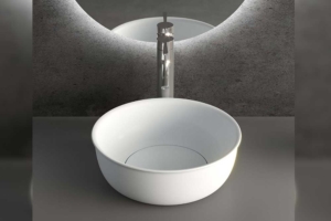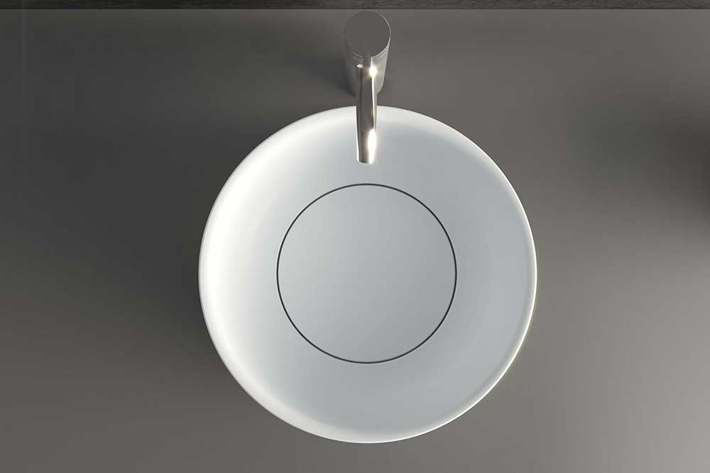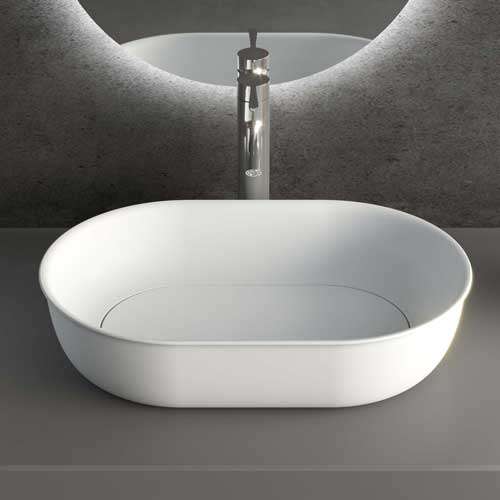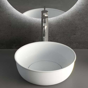 Round tvättställ är tillverkat av ett hållfast kompositmaterial med ”Solid Surface”. Ytan på tvättstället är slittålig, färgstabil och lätt att hålla ren, färgen är mattvit.