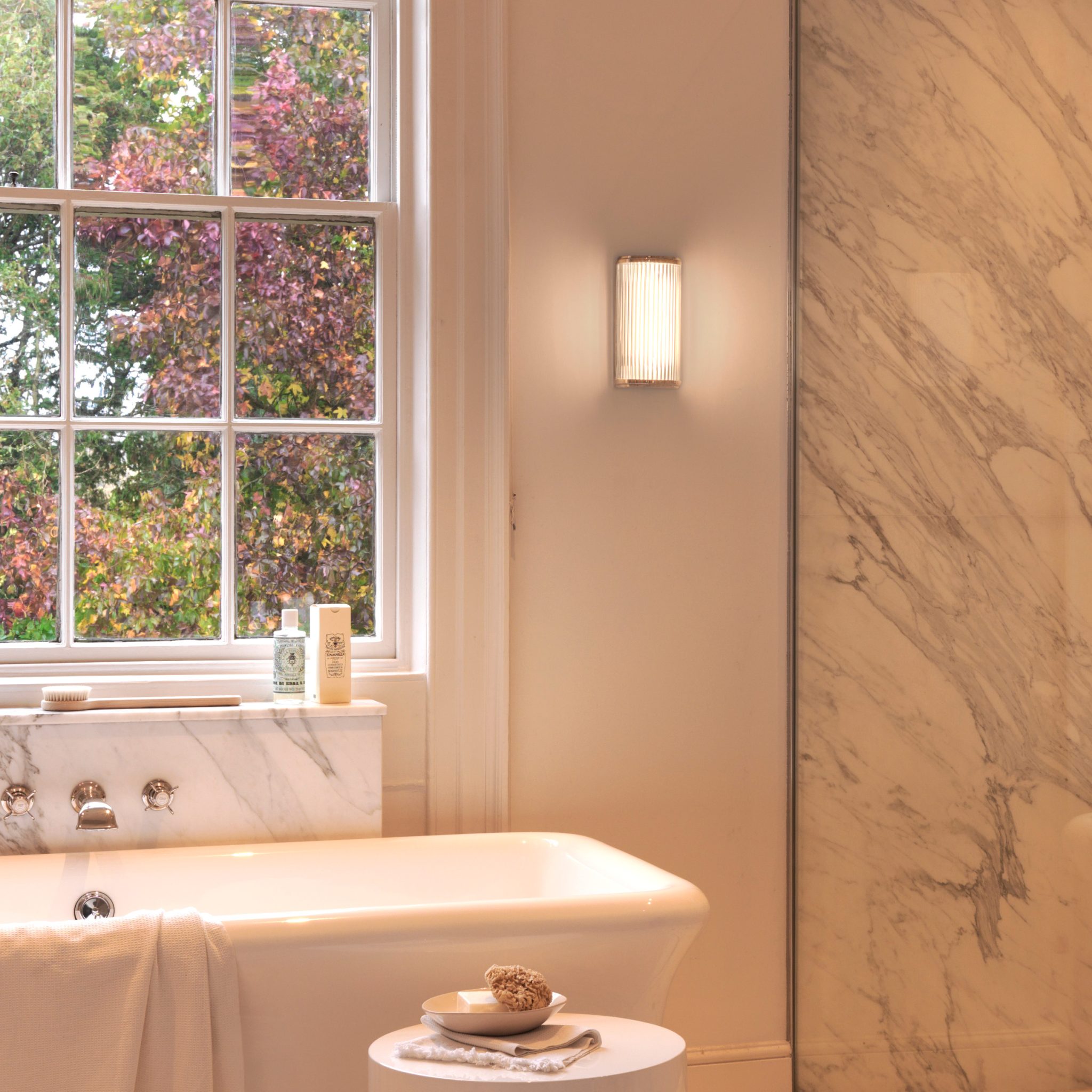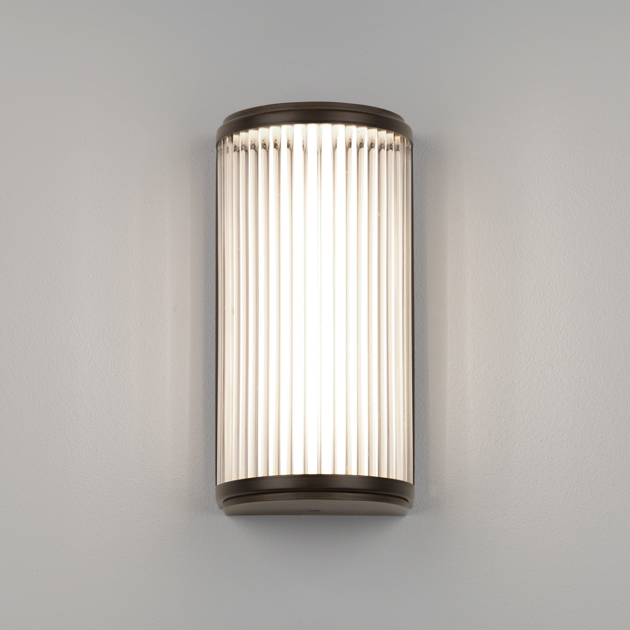 Versailles 250 Phase Dimmable vägglampa. Dimbar väggarmatur som passar både badrum och övrig inredning. Glasskärm konstruerad av individuella glasstavar för ett unikt och trivsamt ljussken.